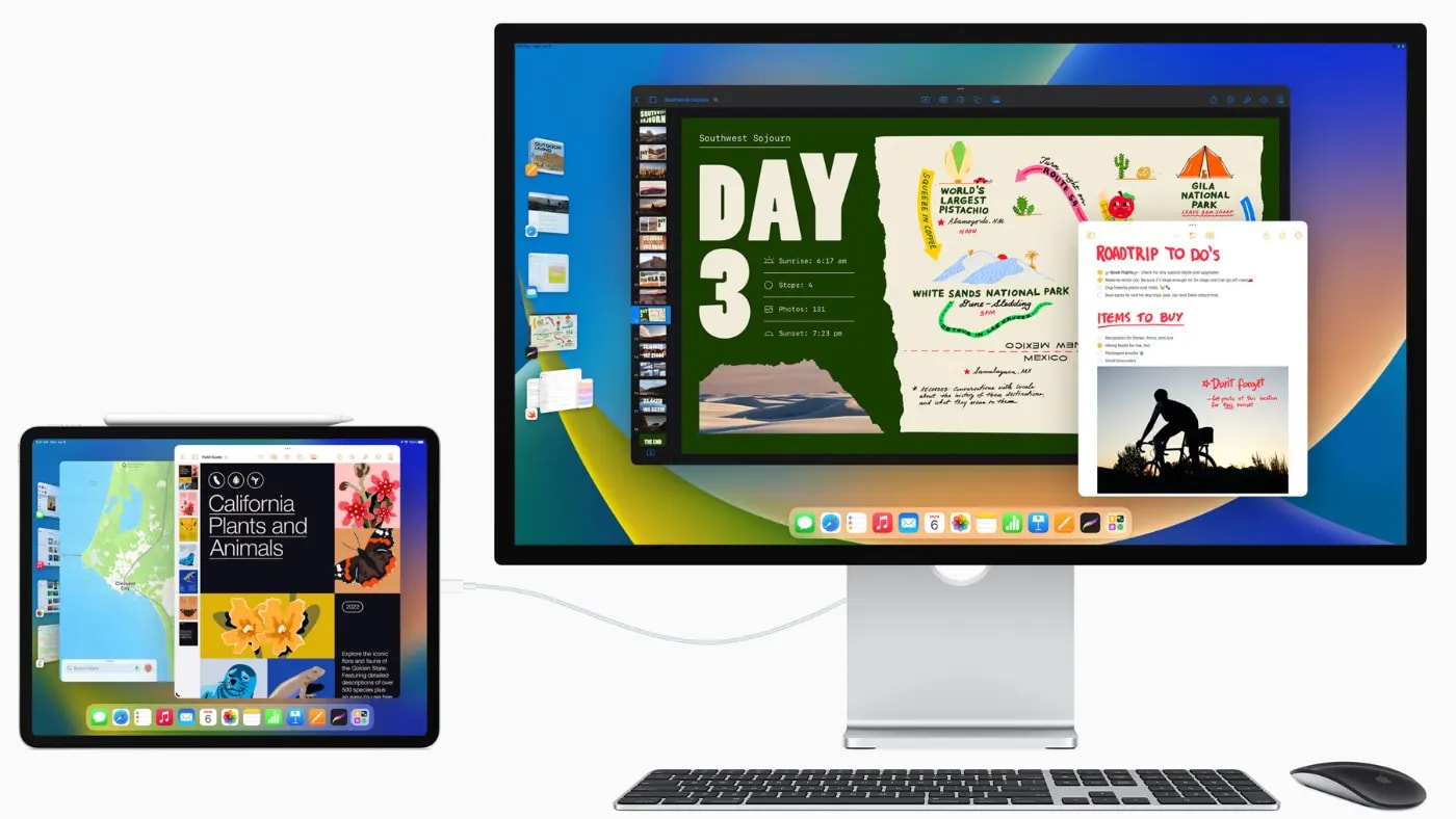 An iPad connected to an Apple Studio Display with Stage Manager External Display Support. Credit: Apple