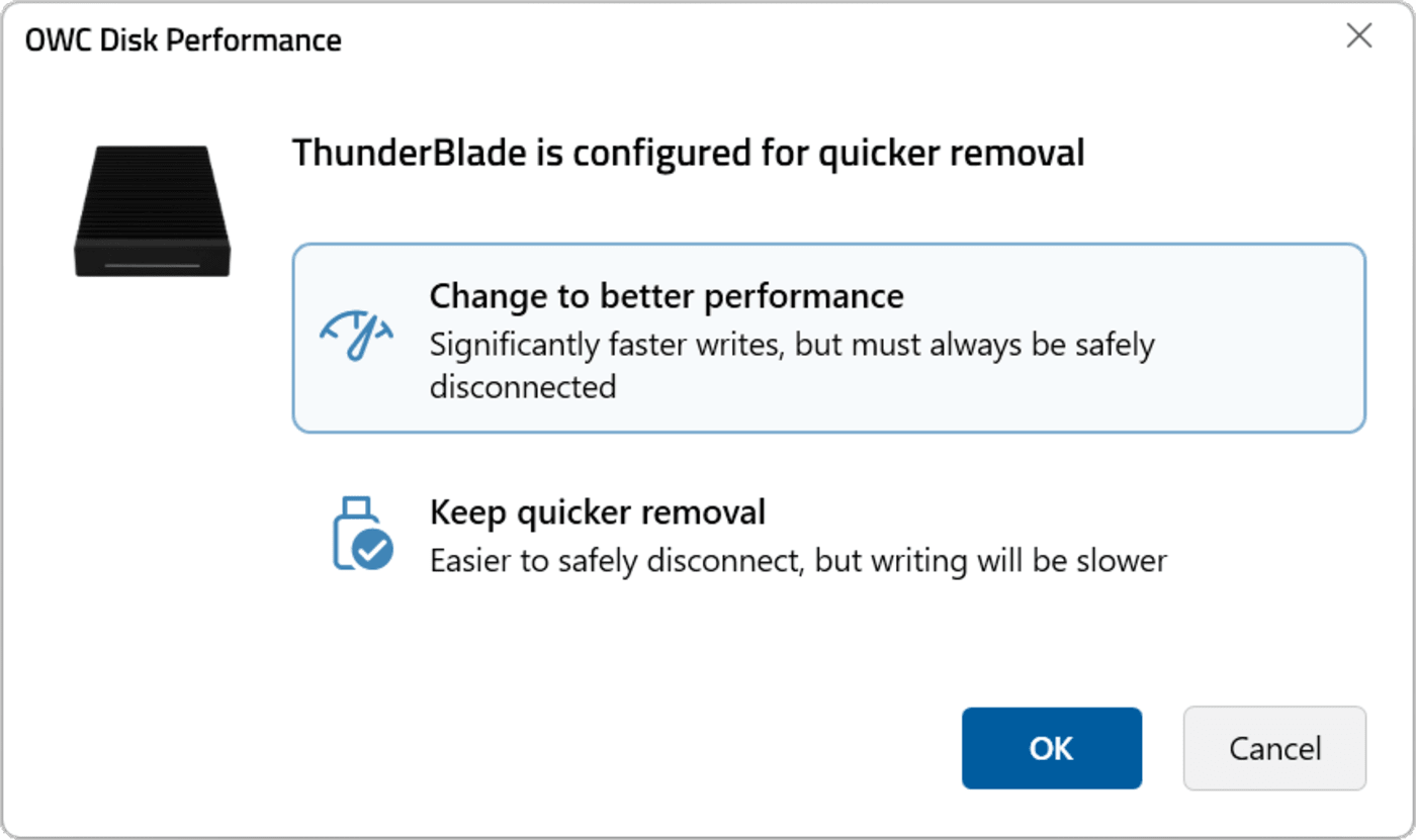 The OWC Disk Performance tool allows Windows users to easily change Windows disk settings to favor “better performance” or “quick removal” with just a click. Windows sometimes defaults to “quick removal” which isn’t predictable or desirable for high-speed devices, such as OWC's ThunderBlade and Express 1M2. The setting can also cause extremely slow write speeds. It can be changed manually, but it is a tedious task. OWC Disk Performance makes that task quick and painless.
